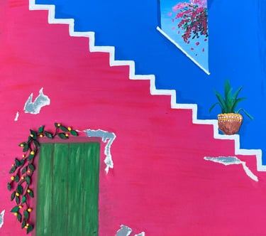 Para realizar este trabajo me inspiré en dos plantas del desierto: la bugambilia y la biznaga, originarias de Baja California Sur. Elegí el tema de México contemporáneo, pero quise darle un enfoque más artístico y equilibrarlo con la arquitectura, partiendo de la idea de que la pintura puede funcionar como la “fachada” de unas escaleras.