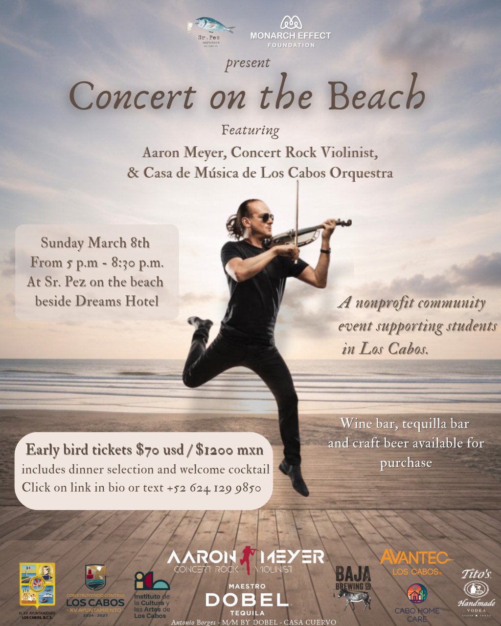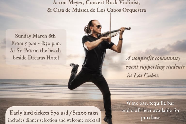 We live here in Cabo and how many of us can say we've been to a Concert on the Beach??! Our friends at Sr. Pez are making it possible - hosting Concert Rock Violinist Aaron Meyer and special guests Orquesta de Casa de Música del Instituto de Los Cabos and we are all invited!